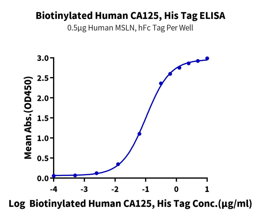 Immobilized Biotinylated Human CA125, His Avi Tag at 5ug/ml(100ul/well) on the streptavidin precoated plate (5ug/ml). Dose response curve for Human MSLN, hFc Tag with the EC50 of 0.78ug/ml determined by ELISA. |