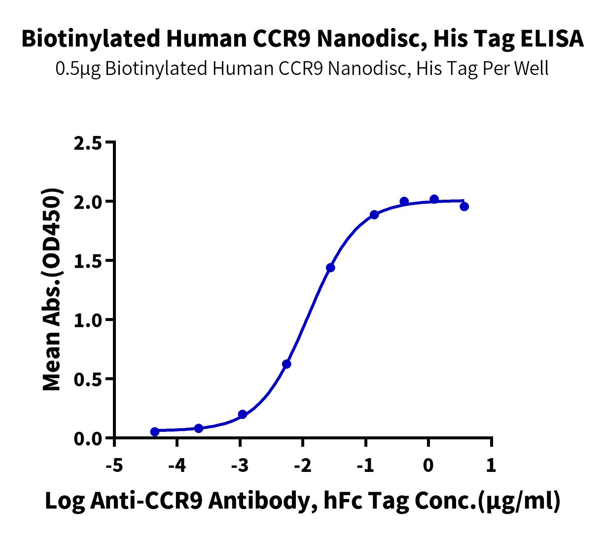 - Activity: Immobilized Biotinylated Human CCR9 Nanodisc, His Tag at 5ug/ml (100ul/well) on the streptavidin precoated plate(5ug/ml). Dose response curve for Anti-CCR9 Antibody, hFc Tag with the EC50 of 12.2ng/ml determined by ELISA. The affinity constant of 5.90 nM as determined in SPR assay (Biacore T200).