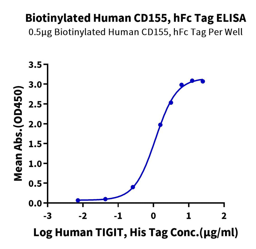 - Activity: Immobilized Biotinylated Human CD155, hFc Tag at 5ug/ml (100ul/Well) on streptavidin (5ug/ml) precoated plate. Dose response curve for Human TIGIT, His Tag with the EC50 of 1.14ug/ml determined by ELISA (QC Test).