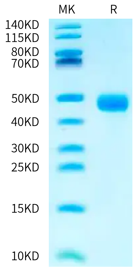 The protein has a predicted MW of 33.89 kDa. Due to glycosylation, the protein migrates to 42-52 kDa based on Bis-Tris PAGE result. |