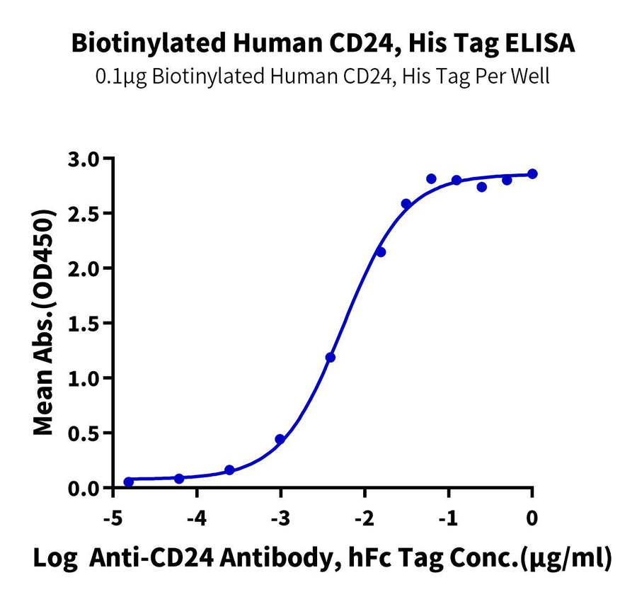 - Activity: Immobilized Biotinylated Human CD24, His Tag at 1ug/ml (100ul/well) on the streptavidin precoated plate (5ug/ml). Dose response curve for Anti-CD24 Antibody, hFc Tag with the EC50 of 5.5ng/ml determined by ELISA (QC Test).