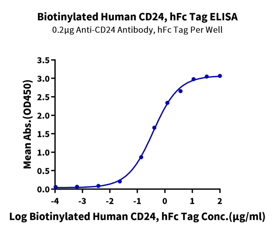 - Activity: Immobilized Anti-CD24 Antibody, hFc Tag at 2ug/ml (100ul/well) on the plate. Dose response curve for Biotinylated Human CD24, hFc Tag with the EC50 of 0.38ug/ml determined by ELISA.