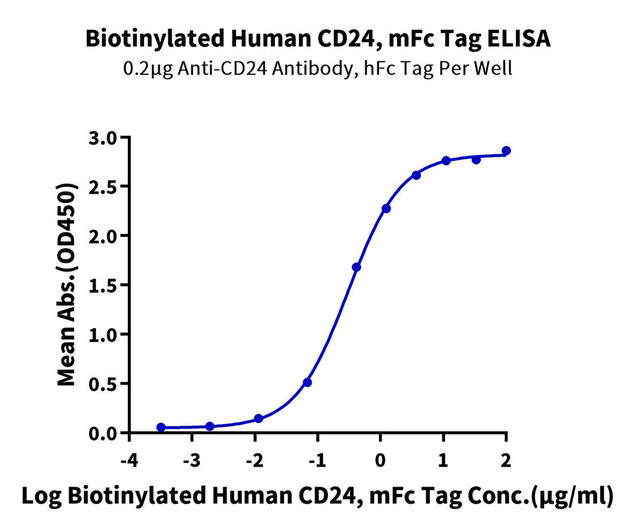 - Activity: Immobilized Anti-CD24 Antibody at 2ug/ml (100ul/Well) on the plate. Dose response curve for Biotinylated Human CD24, mFc Tag with the EC50 of 0.31ug/ml determined by ELISA.
