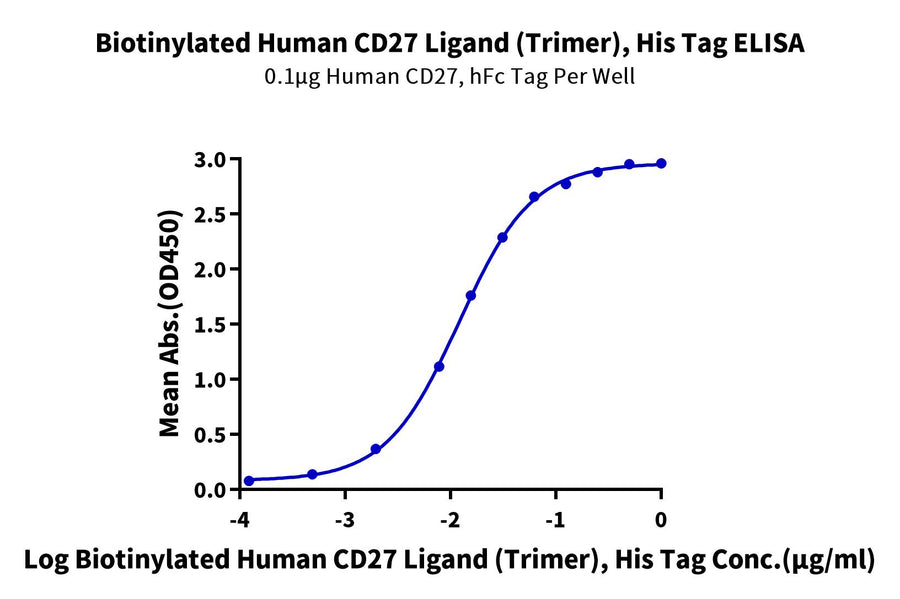 Immobilized Human CD27, hFc Tag at 1ug/ml (100ul/Well) on the plate. Dose response curve for Biotinylated Human CD27 Ligand (Trimer), His Tag with the EC50 of 12.1ng/ml determined by ELISA (QC Test). |
