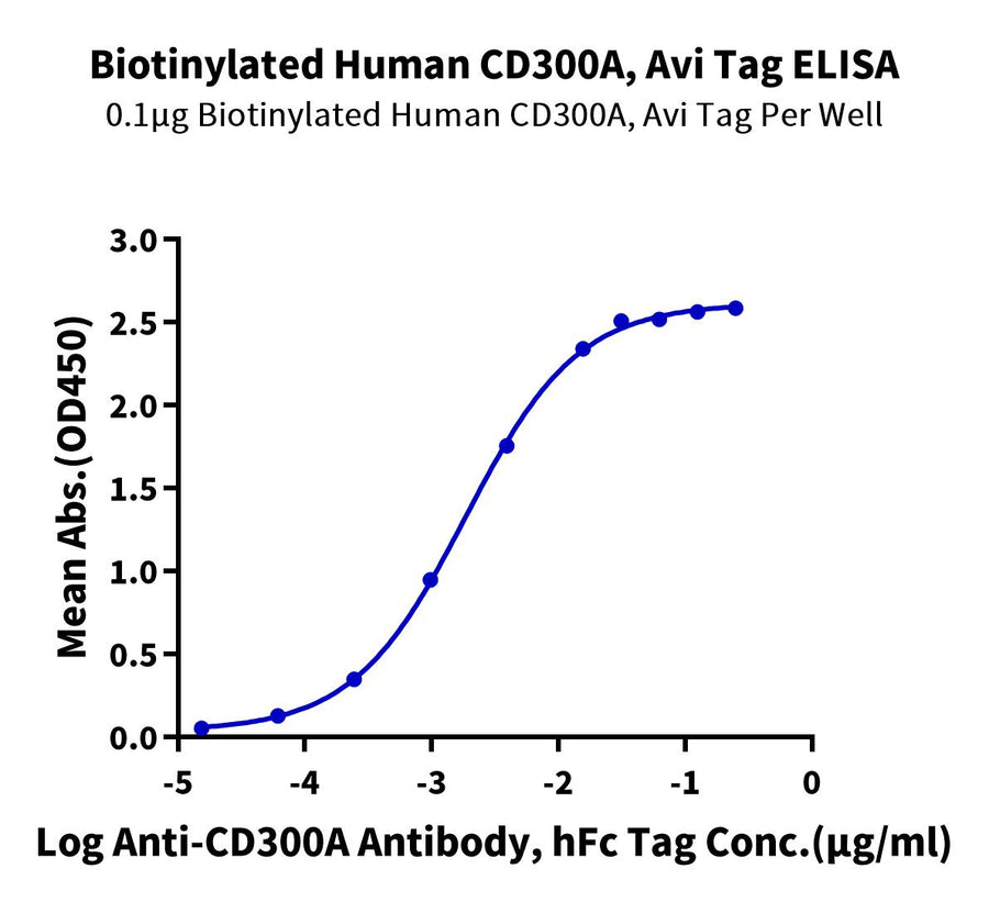 - Activity: Immobilized Biotinylated Human CD300A, Avi Tag at 1ug/ml (100ul/well) on the streptavidin precoated plate (5ug/ml). Dose response curve for Anti-CD300A Antibody, hFc Tag with the EC50 of 1.8ng/ml determined by ELISA (QC Test).