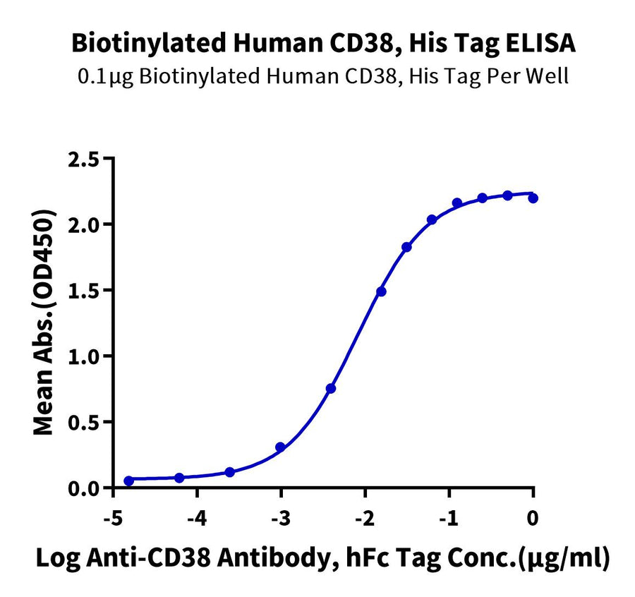 - Activity: Immobilized Biotinylated Human CD38, His Tag at 1ug/ml (100ul/well) on the streptavidin precoated plate(5ug/ml). Dose response curve for Anti-CD38 Antibody, hFc Tag with the EC50 of 8.1ng/ml determined by ELISA.