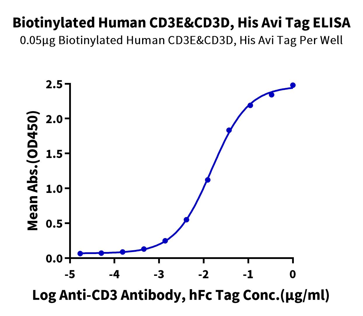 Immobilized Biotinylated Human CD3E&CD3D, His Avi Tag at 0.5ug/ml (100ul/well) on the streptavidin precoated plate (5ug/ml). Dose response curve for OKT3, mFc Tag with the EC50 of 42.0ng/ml determined by ELISA. |