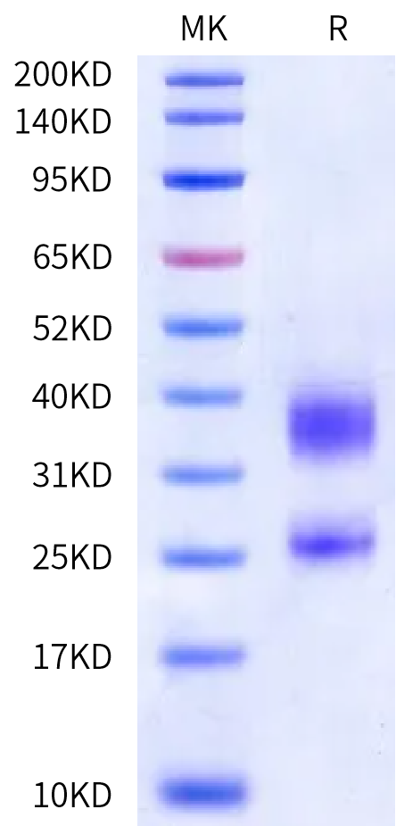 The protein has a predicted MW of 17.9 kDa (CD3E) and 18.52 kDa (CD3D). Due to glycosylation, the protein migrates to 23-27 kDa and 32-40 kDa based on Bis-Tris PAGE result. |