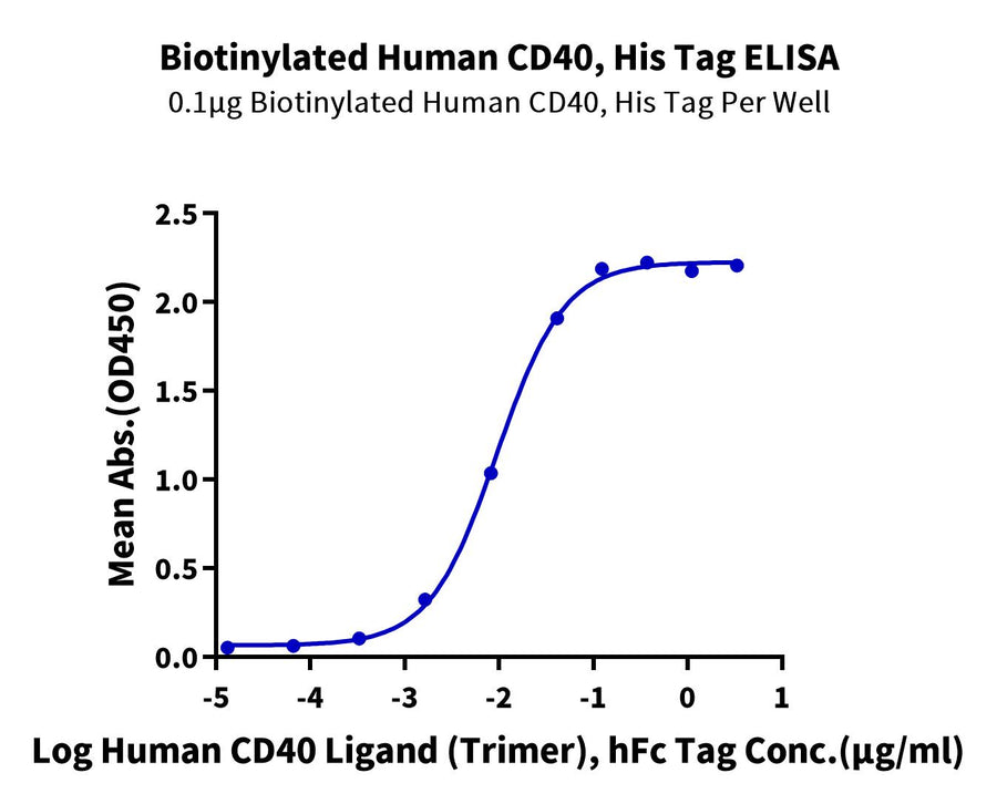 - Activity: Immobilized Biotinylated Human CD40, His Tag at 1ug/ml (100ul/well) on the streptavidin precoated plate (5ug/ml). Dose response curve for Human/Cynomolgus/Rhesus macaque CD40 Ligand (Trimer), hFc Tag with the EC50 of 9.5ng/ml determined by ELISA (QC test).