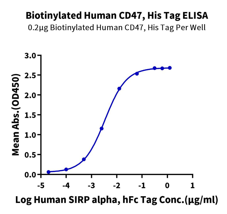 - Activity: Immobilized Biotinylated Human CD47, His Tag at 2ug/ml (100ul/well) on the streptavidin precoated plate (5ug/ml). Dose response curve for Human SIRP alpha, hFc Tag with the EC50 of 3.4ng/ml determined by ELISA.