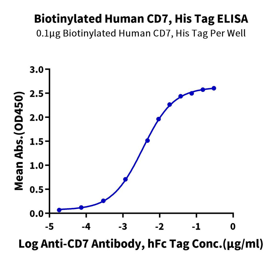 - Activity: Immobilized Biotinylated Human CD7, His Tag at 1 ug/ml (100 ul/well) on the streptavidin precoated plate (5 ug/ml). Dose response curve for Anti-CD7 Antibody, hFc Tag with the EC50 of 3.5 ng/ml determined by ELISA (QC Test).