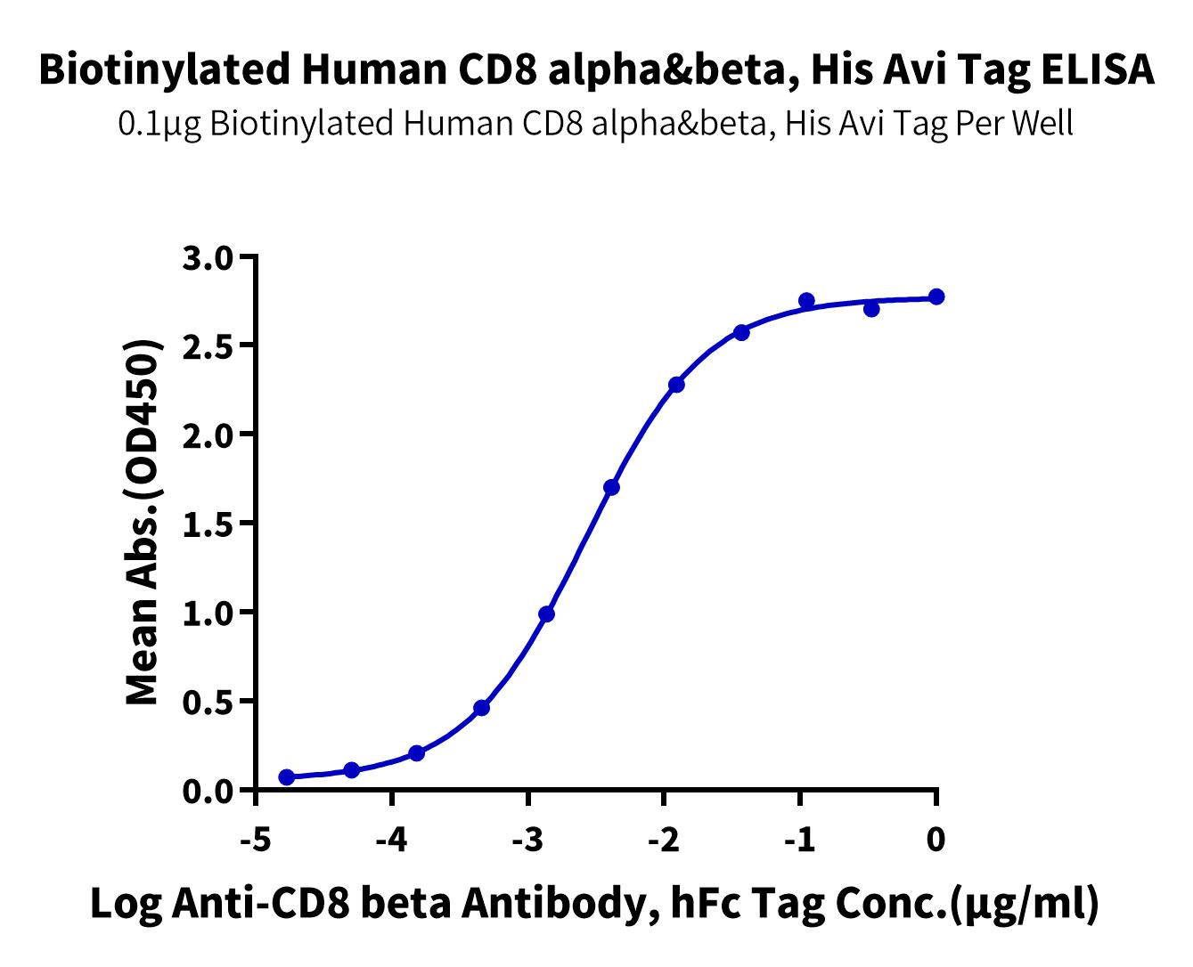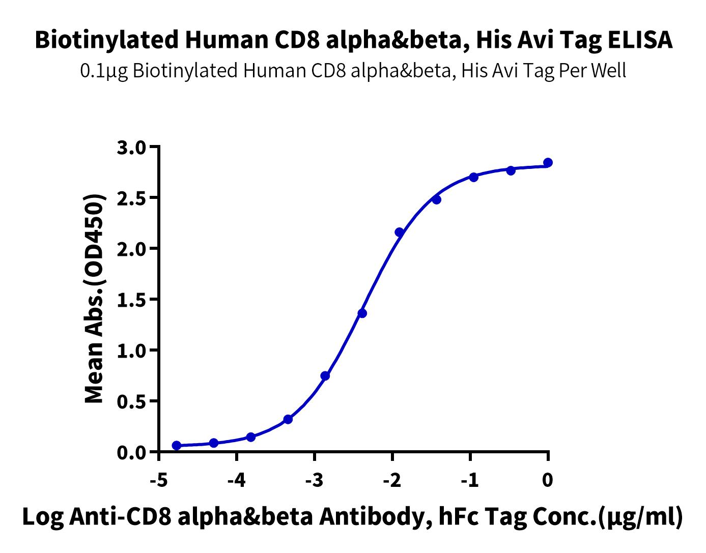 Immobilized Biotinylated Human CD8 alpha&beta, His Avi Tag at 1ug/ml (100ul/well) on the streptavidin precoated plate (5ug/ml). Dose response curve for Anti-CD8 alpha&beta Antibody, hFc Tag with the EC50 of 4.3ng/ml determined by ELISA. |