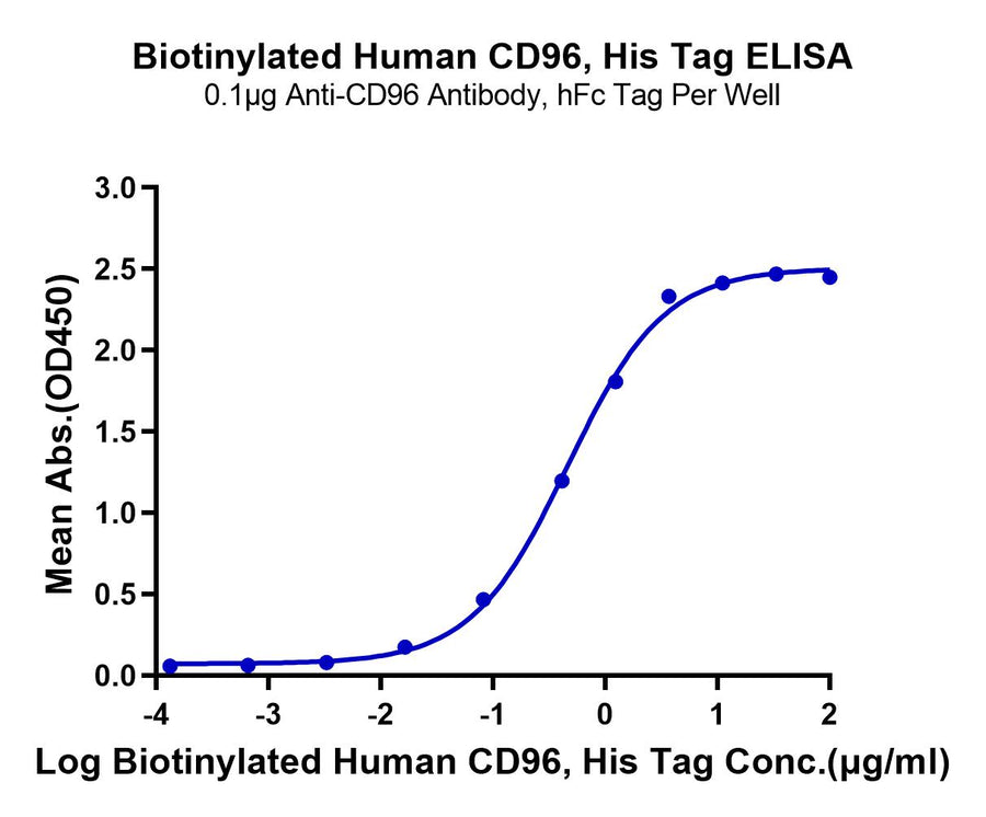 - Activity: Immobilized Biotinylated Human CD96, His-Avi Tag at 2ug/ml (100ul/Well) on streptavidin (5ug/ml) precoated plate. Dose response curve for Anti-CD96 Antibody, hFc Tag with the EC50 of 19.8ng/ml determined by ELISA.