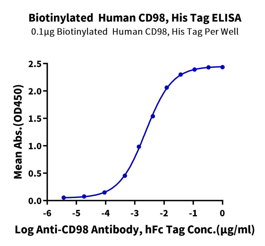- Activity: Immobilized Biotinylated Human CD98, His Tag at 1ug/ml (100ul/well) on the streptavidin precoated plate (5ug/ml). Dose response curve for HAnti-CD98 Antibody, hFc Tag with the EC50 of 2.3ng/ml determined by ELISA.