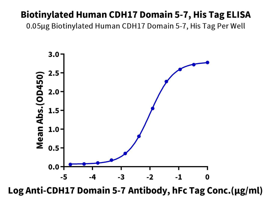 - Activity: Immobilized Biotinylated Human CDH17 Domain 5-7, His Tag at 0.5ug/ml (100ul/well) on the streptavidin precoated plate (5ug/ml). Dose response curve for Anti-CDH17 Domain 5-7 Antibody, hFc Tag with the EC50 of 10.2ng/ml determined by ELISA.