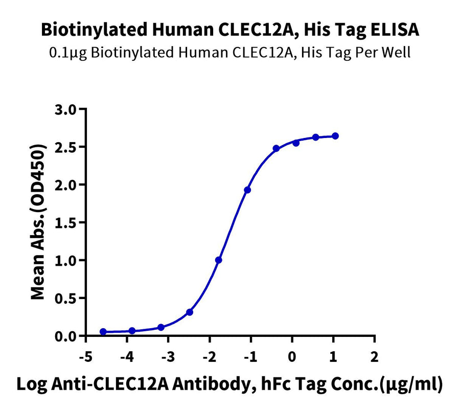 - Activity: Immobilized Biotinylated Human CLEC12A, His Tag at 1ug/ml (100ul/well) on the streptavidin precoated plate (5ug/ml). Dose response curve for Anti-CLEC12A Antibody, hFc Tag with the EC50 of 29.6ng/ml determined by ELISA.