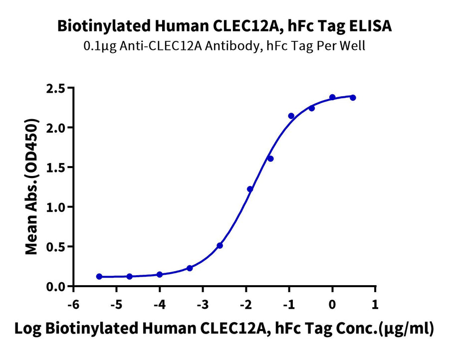 - Activity: Immobilized Anti-CLEC12A Antibody, hFc Tag at 1ug/ml (100ul/Well) on the plate. Dose response curve for Biotinylated Human CLEC12A, hFc Tag with the EC50 of 14.9ng/ml determined by ELISA.