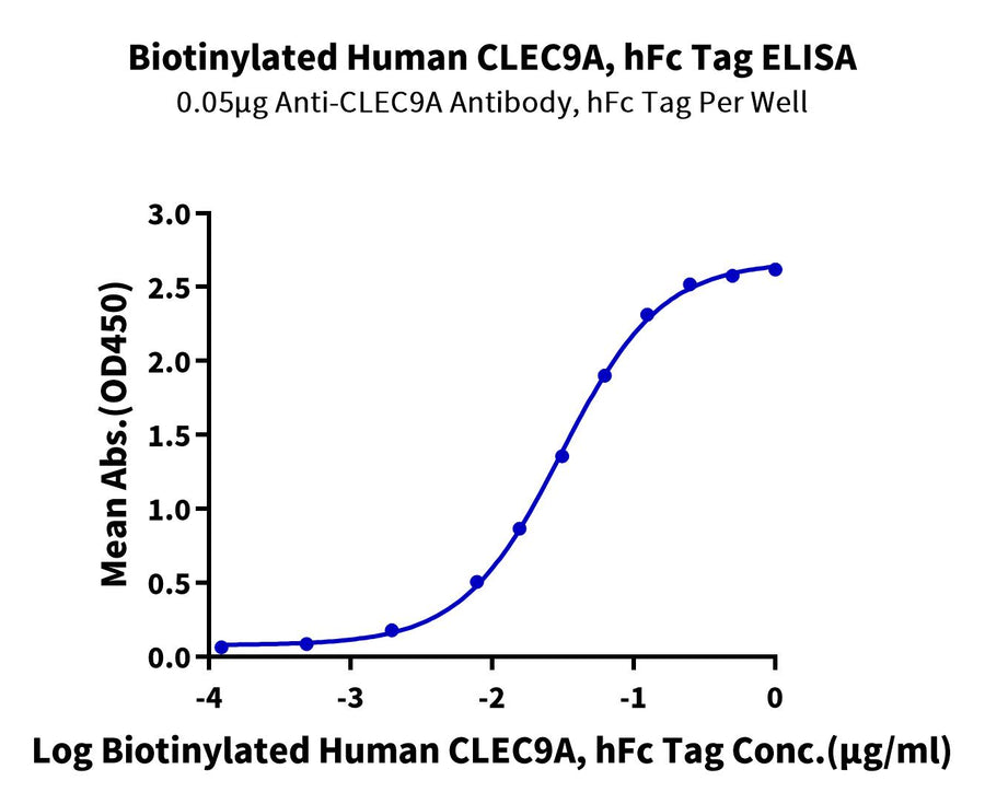 - Activity: Immobilized Anti-CLEC9A Antibody, hFc Tag at 0.5ug/ml (100ul/well) on the plate. Dose response curve for Biotinylated Human CLEC9A, hFc Tag with the EC50 of 30.9ng/ml determined by ELISA (QC Test).