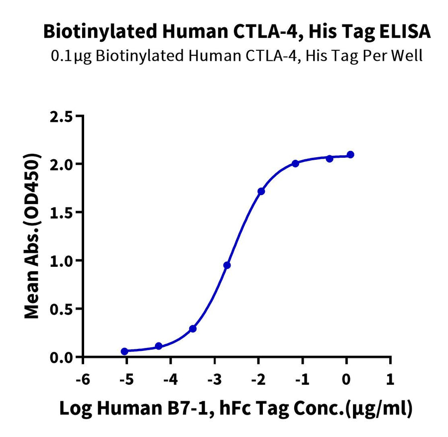 - Activity: Immobilized Biotinylated Human CTLA-4, His Tag at 1ug/ml (100ul/well) on the streptavidin precoated plate (5ug/ml). Dose response curve for Human B7-1, hFc Tag with the EC50 of 2.4ng/ml determined by ELISA (QC Test).