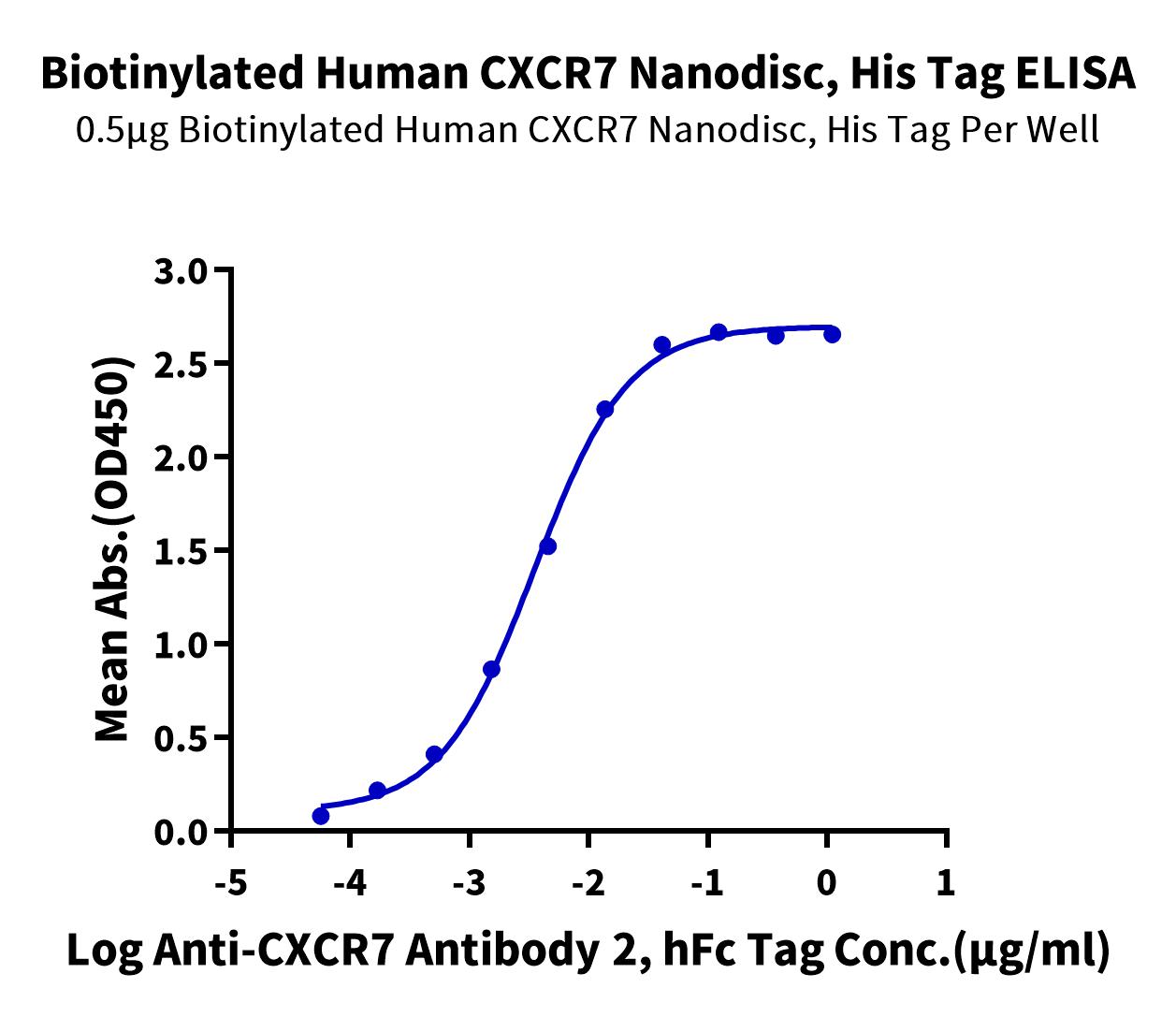 - Activity: Immobilized Biotinylated Human CXCR7 Nanodisc, His Tag at 5ug/ml (100ul/well) on the streptavidin precoated plate (5ug/ml). Dose response curve for Anti-CXCR7 Antibody 1, hFc Tag with the EC50 of 24.2ng/ml determined by ELISA. The affinity constant of 3.22 nM as determined in SPR assay (Biacore T200).