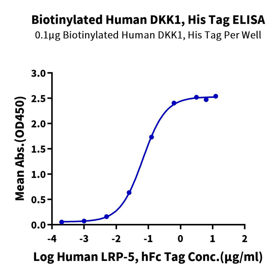 Immobilized Biotinylated Human DKK1, His Tag at 1ug/ml (100ul/well) on the streptavidin precoated plate (5ug/ml). Dose response curve for Human LRP-5, hFc Tag with the EC50 of 66.8ng/ml determined by ELISA (QC Test). |