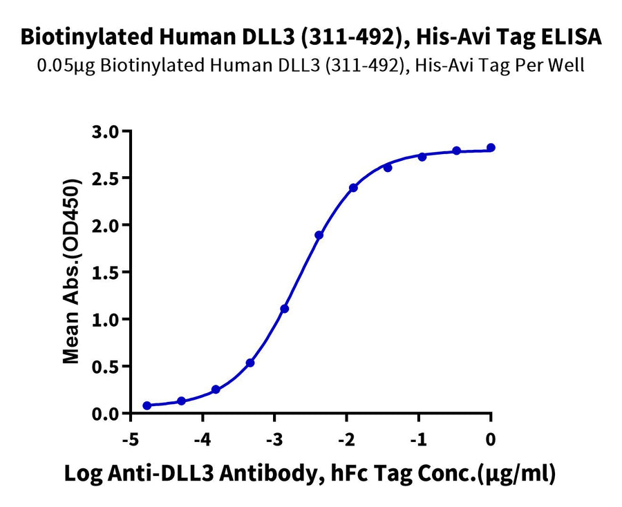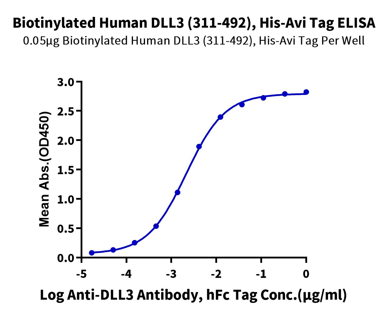 Immobilized Biotinylated Human DLL3 (311-492), His-Avi Tag at 0.5ug/ml (100ul/Well) on streptavidin (5ug/ml) precoated plate. Dose response curve for Anti-DLL3 Antibody, hFc Tag with the EC50 of 2.1ng/ml determined by ELISA. |