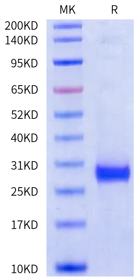 The protein has a predicted MW of 22.69 kDa. Due to glycosylation, the protein migrates to 25-30 kDa based on Bis-Tris PAGE result. |