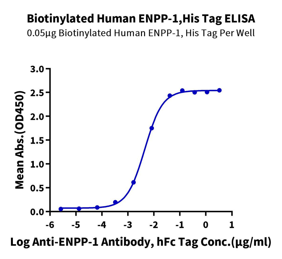 - Activity: Immobilized Biotinylated Human ENPP-1, His Tag at 0.5ug/ml (100ul/well) on the streptavidin precoated plate (5ug/ml). Dose response curve for Anti-ENPP-1 Antibody, hFc Tag with the EC50 of 4.5ng/ml determined by ELISA. See testing image for detail.Measured by its ability to hydrolyze thymidine 5'-monophosphate p-nitrophenyl ester. The specific activity is > 40000 pmol/min/ug.
