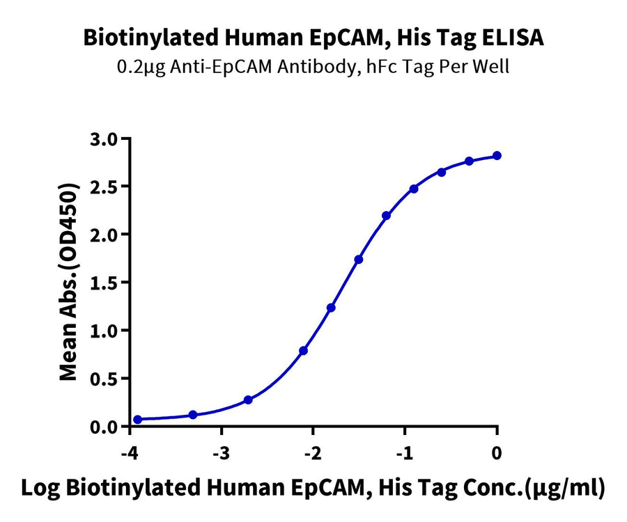 - Activity: Immobilized Anti-EpCAM Antibody, hFc Tag at 2ug/ml (100ul/well) on the plate. Dose response curve for Biotinylated Human EpCAM, His Tag with the EC50 of 21.1ng/ml determined by ELISA (QC Test).