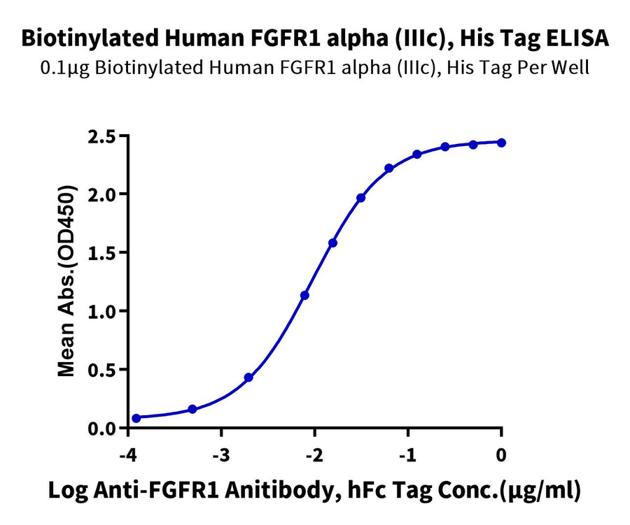 - Activity: Immobilized Biotinylated Human FGFR1 alpha (IIIc), His Tag at 1ug/ml (100ul/well) on the streptavidin precoated plate (5ug/ml). Dose response curve for Anti-FGFR1 Antibody, hFc Tag with the EC50 of 10.8ng/ml determined by ELISA.