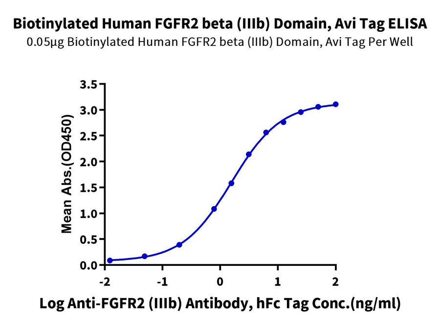 Immobilized Biotinylated Human FGFR2 beta (IIIb) Domain, Avi Tag at 0.5 ug/ml (100 ul/well) on the streptavidin precoated plate (5 ug/ml). Dose response curve for Anti-FGFR2 (IIIb) Antibody, hFc Tag with the EC50 of 1.6 ng/ml determined by ELISA (QC Test). |