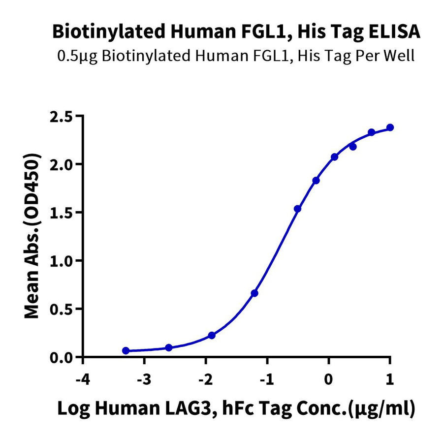 Immobilized Biotinylated Human FGL1, His Tag at 5ug/ml (100ul/well) on the streptavidin precoated plate (5ug/ml). Dose response curve for Human LAG3, hFc Tag with the EC50 of 0.19ug/ml determined by ELISA (QC Test). |