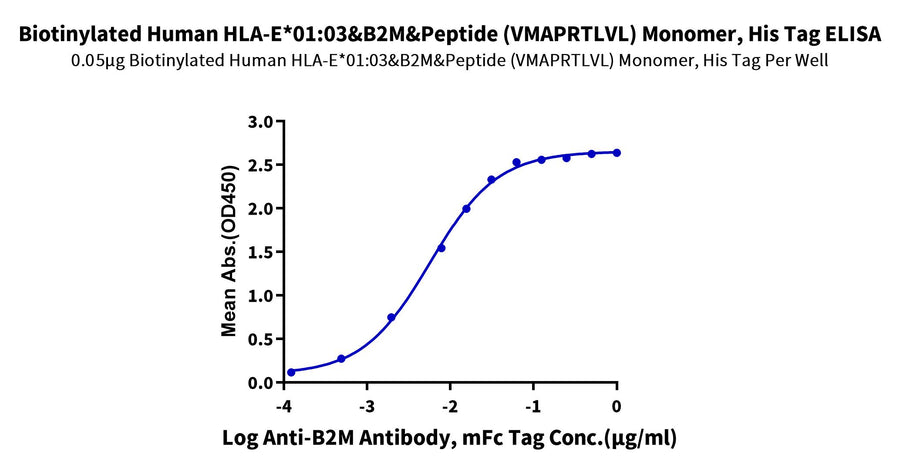 - Activity: Immobilized Biotinylated Human HLA-E*01:03&B2M&Peptide (VMAPRTLVL) Monomer, His Tag at 0.5ug/ml (100ul/Well) on streptavidin (5ug/ml) precoated plate. Dose response curve for Anti-B2M Antibody, mFc Tag with the EC50 of 5.7ng/ml determined by ELISA (QC Test).