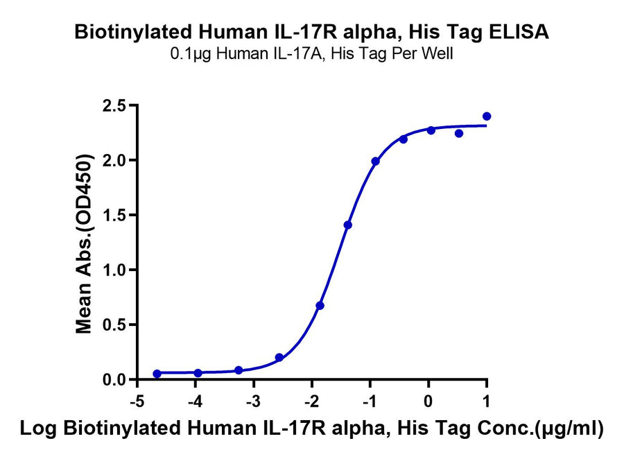 - Activity: Immobilized Human IL-17A, His Tag at 1ug/ml (100ul/well) on the plate. Dose response curve for Biotinylated Human IL-17R alpha, His Tag with the EC50 of 29.9ng/ml determined by ELISA (QC Test).