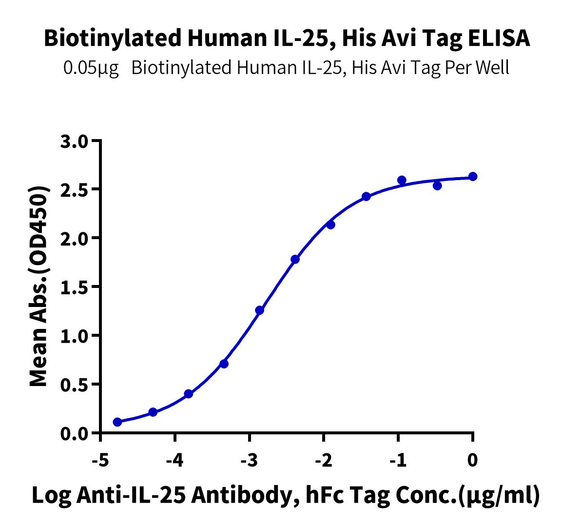 Immobilized Biotinylated Human IL-25, His Avi Tag at 0.5ug/ml (100ul/well) on the streptavidin precoated plate (5ug/ml). Dose response curve for Anti-IL-25 Antibody, hFc Tag with the EC50 of 1.7ng/ml determined by ELISA. Immobilized Biotinylated Human IL-25, His Avi Tag at 0.5ug/ml (100ul/well) on the streptavidin precoated plate (5ug/ml). Dose response curve for Anti-IL-25 Antibody, hFc Tag with the EC50 of 1.7ng/ml determined by ELISA.