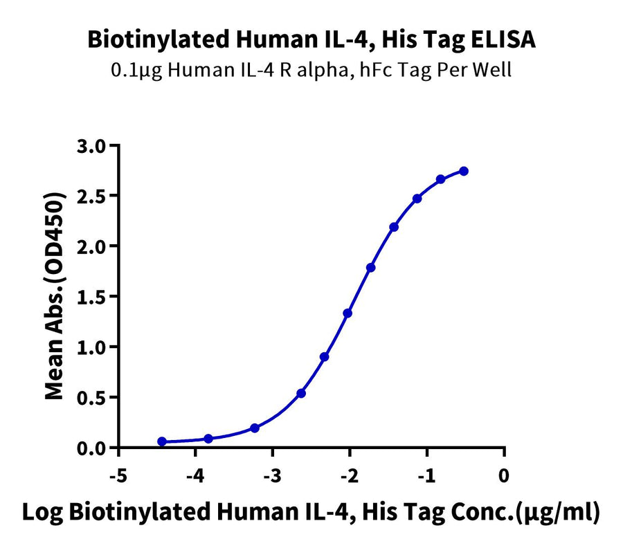 - Activity: Immobilized Human IL-4 R alpha, hFc Tag at 1 ug/ml (100 ul/Well) on the plate. Dose response curve for Biotinylated Human IL-4, His Tag with the EC50 of 8.8 ng/ml determined by ELISA.