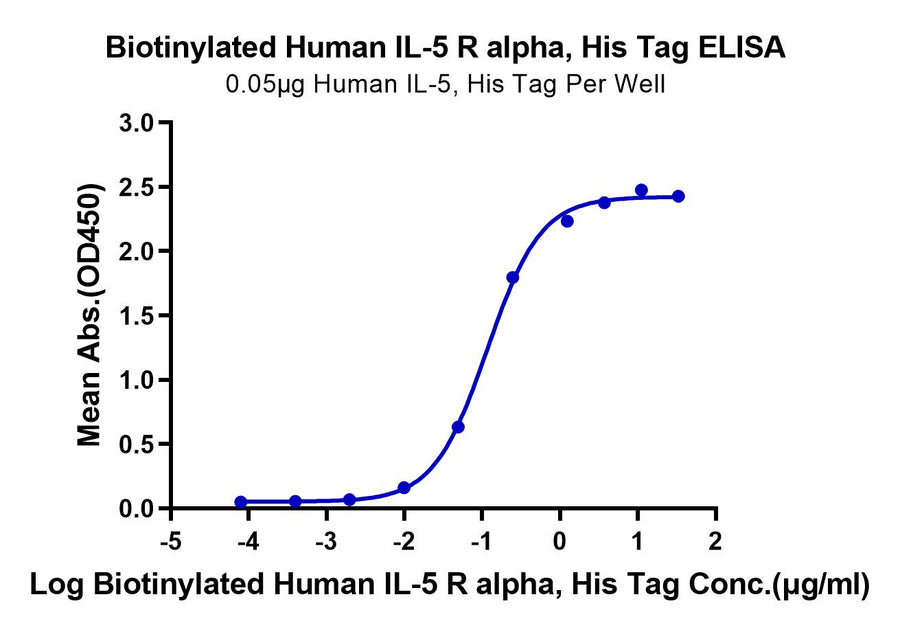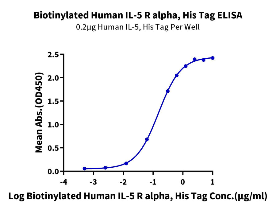 - Activity: Immobilized Human IL-5, His Tag at 2ug/ml (100ul/well) on the plate. Dose response curve for Biotinylated Human IL-5 R alpha, His Tag with the EC50 of 0.15ug/ml determined by ELISA.