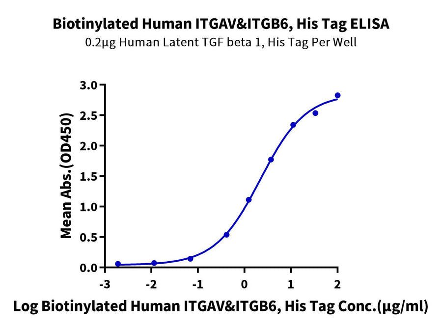 - Activity: Immobilized Human Latent TGF beta 1, His Tag at 2ug/ml (100ul/well) on the plate. Dose response curve for Biotinylated Human ITGAV&ITGB6, His Tag with the EC50 of 2.2ug/ml determined by ELISA (QC Test).
