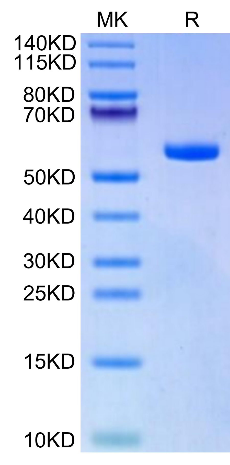 The protein has a predicted MW of 50.30 kDa. Due to glycosylation, the protein migrates to 52-62 kDa based on Bis-Tris PAGE result. |