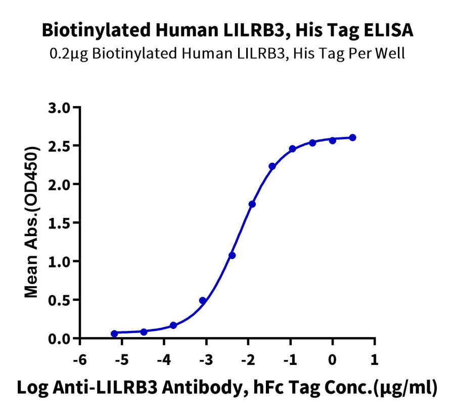 - Activity: Immobilized Biotinylated Human LILRB3, His Tag at 2ug/ml (100ul/well) on the streptavidin precoated plate (5ug/ml). Dose response curve for Anti-LILRB3 Antibody, hFc Tag with the EC50 of 6.0ng/ml determined by ELISA.