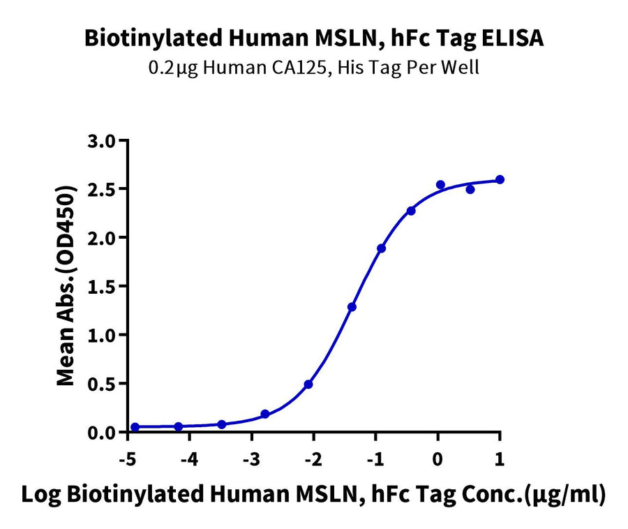 - Activity: Immobilized Human CA125, His Tag at 2ug/ml (100ul/well) on the plate. Dose response curve for Biotinylated Human MSLN, hFc Tag with the EC50 of 44.1ng/ml determined by ELISA (QC Test). See testing image for detail.