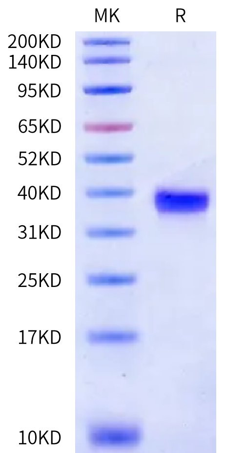 The protein has a predicted MW of 27.32 kDa. Due to glycosylation, the protein migrates to 32-40 kDa based on Bis-Tris PAGE result. |