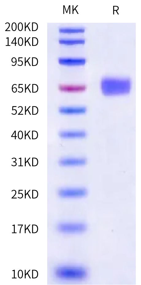 The protein has a predicted MW of 54.62 kDa. Due to glycosylation, the protein migrates to 60-75 kDa based on Bis-Tris PAGE result. |
