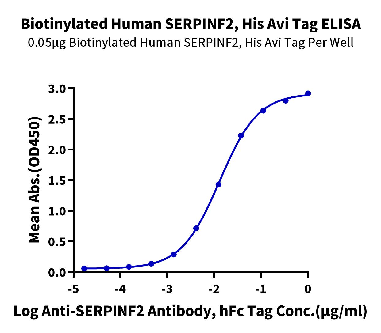 Immobilized Biotinylated Human SERPINF2, His Avi Tag at 0.5ug/ml (100ul/well) on the streptavidin precoated plate (5ug/ml). Dose response curve for Anti-SERPINF2 Antibody, hFc Tag with the EC50 of 13.1ng/ml determined by ELISA. |