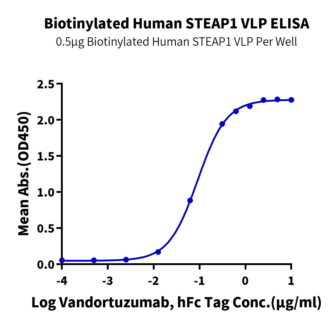 - Activity: Immobilized Biotinylated Human STEAP1 VLP at 5ug/ml (100ul/well) on the streptavidin precoated plate (5ug/ml). Dose response curve for Vandortuzumab, hFc Tag with the EC50 of 91.2ng/ml determined by ELISA. See testing image for detail.
