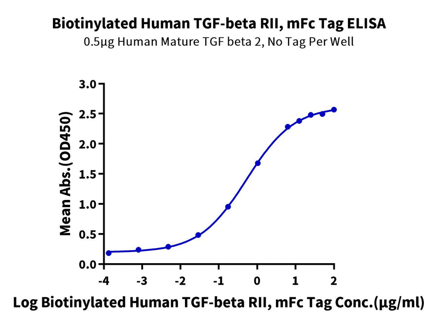 Immobilized Human Mature TGF beta 2, No Tag at 5ug/ml (100ul/Well) on the plate. Dose response curve for Biotinylated Human TGF-beta RII, mFc Tag with the EC50 of 0.53ug/ml determined by ELISA (QC Test). |