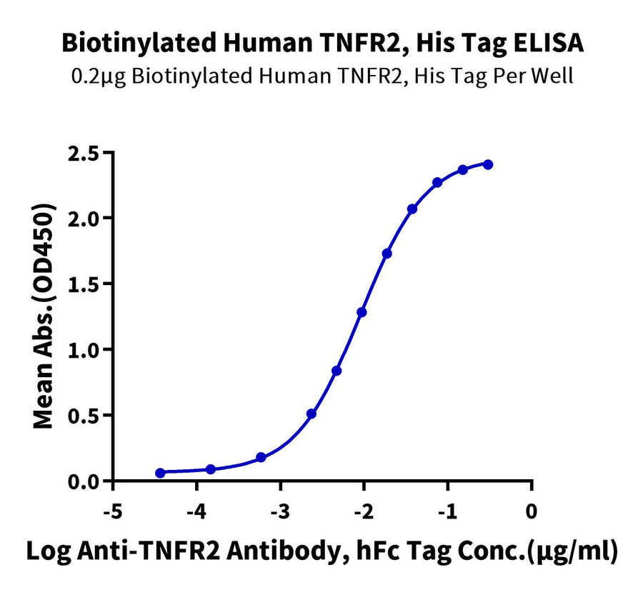 Immobilized Biotinylated Human TNFR2, His Tag at 2ug/ml (100ul/well) on the streptavidin precoated plate (5ug/ml). Dose response curve for Anti-TNFR2 Antibody, hFc Tag with the EC50 of 9.0ng/ml determined by ELISA. |