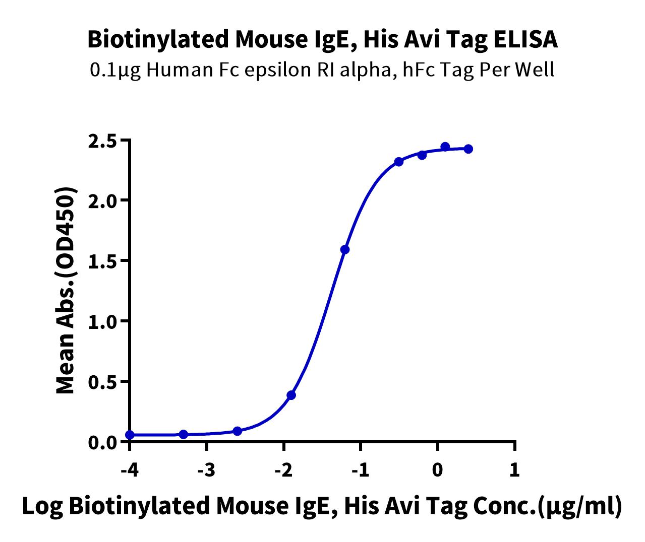 - Activity: Immobilized Human Fc epsilon RI alpha, hFc Tag at 1ug/ml (100ul/well) on the plate. Dose response curve for Biotinylated Mouse IgE, His Avi Tag with the EC50 of 42.0ng/ml determined by ELISA. The affinity constant of 0.42 nM as determined in SPR assay (Biacore T200).