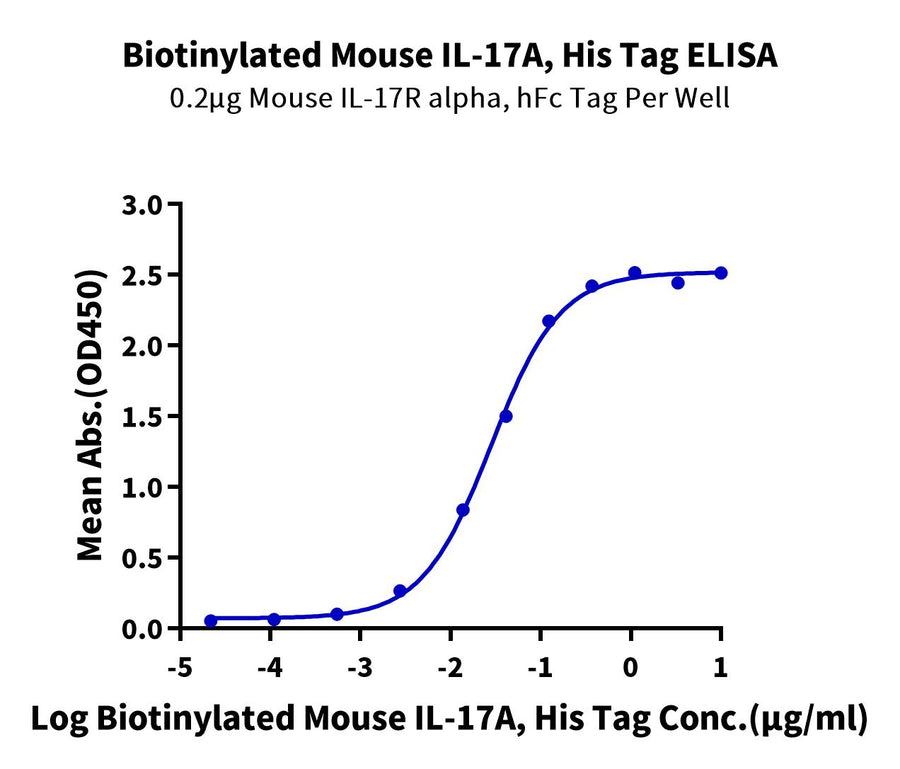 - Activity: Immobilized Mouse IL-17R alpha at 2ug/ml (100ul/well) on the plate. Dose response curve for Biotinylated Mouse IL-17A, His Tag with the EC50 of 28.3ng/ml determined by ELISA.