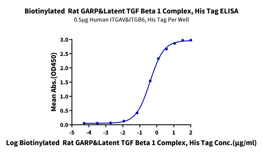 - Activity: mmobilized Human ITGAV&ITGB6, His Tag at 5ug/ml (100ul/well) on the plate. Dose response curve for Biotinylated- Rat GARP&Latent TGF Beta 1 Complex, His Tag with the EC50 of 0.4ug/ml determined by ELISA.
